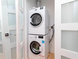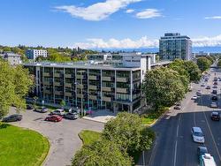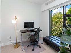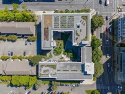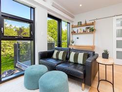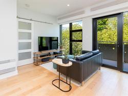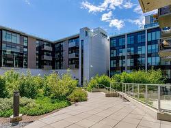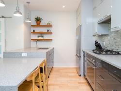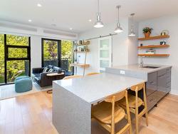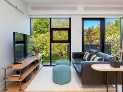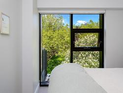Welcome to The Wade—a sophisticated, 2021-built low-rise steel and concrete building that combines modern design with lasting quality. This top-floor corner unit offers over 750 sqft. of bright, thoughtfully designed living space with large windows & serene park views. Open-concept layout features a gourmet kitchen with quartz countertops, stainless steel appliances including a gas cooktop, two toned full-height modern cabinetry & large island with an eating bar—perfect for entertaining. Primary bedroom includes walk-in closet and ensuite with heated tile floor. Additional highlights include in-suite laundry, second full bathroom with heated tile floors, private balcony with a gas BBQ hookup and abundant natural light throughout. Enjoy access to a stunning rooftop terrace with sweeping city views plus your own garden plot and private peaceful courtyard. Well run strata welcomes 2 dogs (any size) with access to secure underground parking, separate storage locker & bike room.