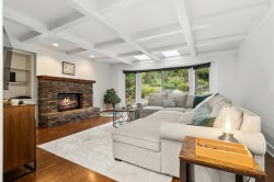 Exceptional family home, tastefully renovated in 2006, offering approx. 3,500 sqft across three levels. The traditional layout includes 4 well-appointed bedrooms upstairs, highlighted by a luxurious primary suite with a walk-in closet and elegant ensuite. Main level features a welcoming foyer, formal living and dining rooms with large windows, rich hardwood and slate flooring, a gourmet island kitchen with breakfast bar, adjoining eating area, family room with coffered ceilings, fireplace and media centre, plus a private office, rec room, and oversized double garage. French doors lead to a beautifully landscaped 1/3 acre with serene patios and lush gardens. Walk to West Bay School, McKechnie Park, and Dundarave.