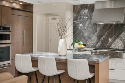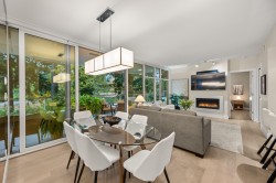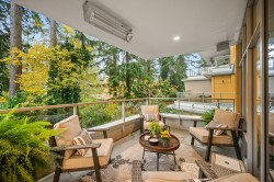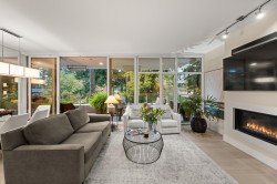 THE BEVERLEY! This home exudes grace & class. Luxury 2-bedroom plus den condo with attention to detail that will impress the most discerning Buyer. Spacious gourmet kitchen features dramatic marble backsplash, large island, deluxe cabinets & top of the line professional-grade integrated appliances (6 burner gas cooktop & wine fridge). Sleek updated fireplace. The generous primary fits a king-sized bed & joins a spa-inspired ensuite. The second bedroom also has its own ensuite. Expansive 228 sq ft balcony, outdoor heaters & full laundry room complete this home. Two side/side parking stalls with EV charger. Beautifully maintained unit in a desirable concrete building with amenities galore. Indoor pool, hot tub, steam, sauna, gym, guest suite & concierge. Live close to everything!