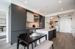 Monaco by Solterra - Elevated living in White Rock. 13 story concrete fully air conditioned, luxury boutique building located just South of Thrift Avenue. Two bedroom plus flex with 2 full bathrooms. Thermador appliances including a 36" fully integrated fridge, wifi enabled convection wall oven, 5 burner gas cooktop, and drawer microwave. Also included is a 24" integrated beverage fridge. Stunning custom kitchen made and designed in Italy and includes a single slab quartz backsplash and quartz hood fan cover. Do you love having a large luxurious ensuite bathroom? This home was made for you! Double vanity, heated tile floors, free standing soaker tub, separate water closet and large stand up shower.
