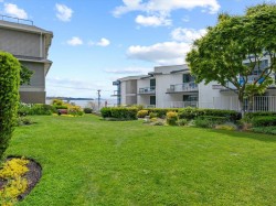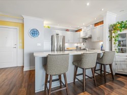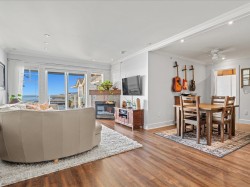 Life looks a little different from the top! From the moment you step inside, sweeping southwest ocean views take centre stage, filling this top-floor 1 bed + den, 2 bath home with light and calm. Designed to feel both elevated and inviting, the flowing layout maximizes comfort and connection to the view. The updated kitchen pairs timeless quartz finishes with premium appliances, creating a polished yet practical space for cooking and gathering. Warmth and character are added by a custom solid wood fireplace mantle, while smart storage solutions and custom wardrobes enhance the home’s clean, organized feel. The bedroom offers a quiet retreat with new plush carpeting, complemented by spa-inspired bathrooms. Complete with two parking stalls & a storage locker. This is elevated coastal living!