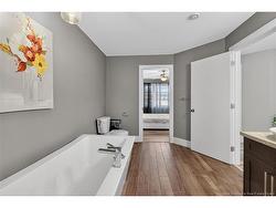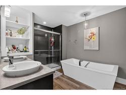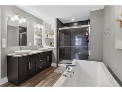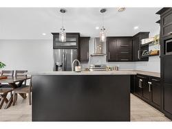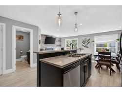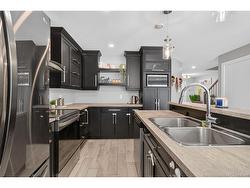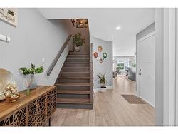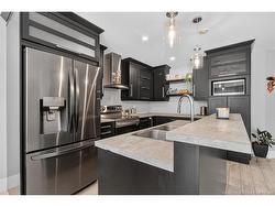 Modern Semi-Detached Home with Income Potential & Geothermal Heating. Welcome to this stunning modern semi-detached home that combines style, space, and smart living. Located in a desirable neighborhood, this beautifully maintained property offers exceptional features including a geothermal heat pump for energy-efficient comfort year-round. Step inside to a large foyer that leads into an inviting open-concept main level. The spacious family room with a cozy fireplace, dining area, and modern kitchen with sleek finishes and stainless steel appliances (fridge and stove purchased in 2023) create the perfect setting for both everyday living and entertaining. A convenient half bath completes the main floor. Upstairs, you’ll find three generously sized bedrooms, including a primary retreat. The spa-inspired bathroom features a stand-alone soaker tub, tiled walk-in shower, and double vanity, your own private oasis. A separate laundry room adds function and convenience. The finished basement offers a separate side entrance, opening up the possibility for an income-generating suite or in-law living. With a large bedroom, full bathroom, and spacious family room, this lower level provides flexibility and value. Outside, enjoy a fully fenced backyard, perfect for pets, children, or private outdoor living. The yard is lined with mature trees, offering privacy in a peaceful natural setting. This home is move-in ready and full of potential, ideal for families, professionals, or investors.