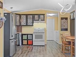 Welcome to 1200 Susan Drive, an excellent opportunity for first-time home buyers, savvy investors, or those looking to comfortably downsize without compromise. This well-maintained two-bedroom, one-bathroom mini home is ideally located within the sought-after Woodbine Mobile Home Park, offering a quiet, friendly community and a convenient lifestyle close to everyday amenities. Inside, you will find a bright and inviting living room that flows seamlessly into the kitchen, creating an open-concept layout perfect for both relaxing and entertaining. The kitchen is well laid out and comes fully equipped with all-new appliances, allowing you to move in with confidence and style. The thoughtful floor plan provides excellent separation and privacy for homeowners, guests, or roommates. The bathroom is centrally located and functional, while recent interior updates add to the home’s overall appeal. New laminate flooring throughout gives the space a clean, modern feel and enhances durability for everyday living. Situated on one of the most desirable streets in the park, this home enjoys a fenced backyard that backs onto a peaceful green belt at the top of the hill, offering added privacy and a natural backdrop. The location also provides easy access to both entrances of the park, making commuting and daily errands simple and efficient. The exterior offers low-maintenance living, giving you more time to enjoy your surroundings and the sense of community park is known for. With green space behind the property, there is room to unwind outdoors, garden, or enjoy a quiet evening outdoors. Pride of ownership is evident throughout, making this property an ideal turnkey option for buyers seeking value, comfort, and location in one great package!