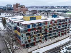 When you buy downtown, you don't want to feel like you squeezed into something because it fit the budget. You want to feel like you chose well. The extra space, the freshness of the layout, the flexibility of design all add up to a really cool home and by the way, a great investment too! The condo also has so much character, the exposed concrete, the nine foot ceilings, the wall of windows all accenting crisp modern finishes. Take the kitchen - sleek high gloss cabinets, quartz countertops and the centre island centre combine the function with the sharp character of the condo. The living room is ideal for you to set up just as you want it, lots of light, the balcony and the right proportions. The primary bedroom adds even more charm, it can be opened to the living space or closed for privacy. The wall of closet space is so good! With the 2nd bedroom there is just so much more flexibility compared to other condos- it can be a den to retreat to, an office for work, or a roommate to help pay the bills! The full bath is modern and generously proportioned while the stacked in unit laundry offers what we expect from condo convenience too! Southport itself has earned its reputation. Secure entry, a well-equipped fitness centre, attractive common areas, double elevators, and a pet-friendly environment. Condo fees include heat, air conditioning, and hot water - meaningful benefits in a downtown building. Step outside and you’re within walking distance of the waterfront, universities, markets, restaurants and everything that makes Barrington Street dynamic and convenient. Parking is available for rent in the building or nearby.