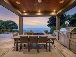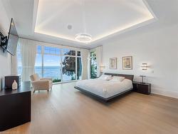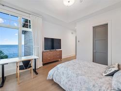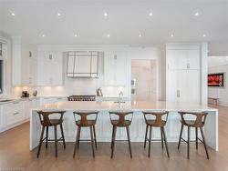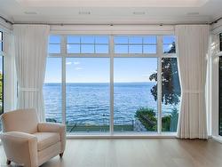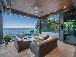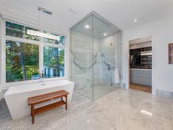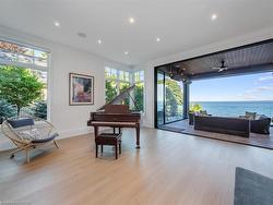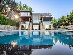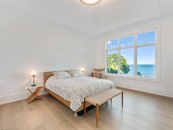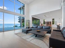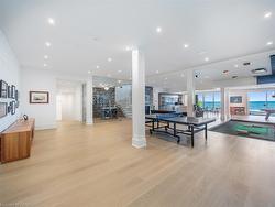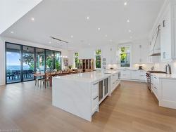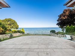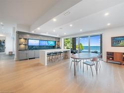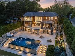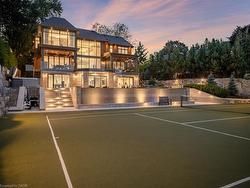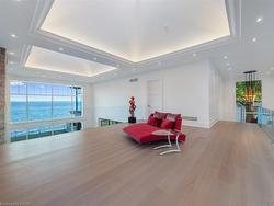 The Haven. A rare waterfront estate on a private laneway in South Burlington. Set on nearly ¾ of an acre with 103 ft of shoreline and full riparian rights, this property offers privacy, direct lake access, 11,417 Sq ft of living space and a lifestyle that feels like a luxury resort without leaving home. Inside, the lake takes centre stage. Floor to ceiling windows in the great room frame the view, anchored by 22-foot ceilings, a dramatic full-height stone fireplace, and a skylight that floods the space with light. A second living room provides another place to unwind, while a private office with 18-foot beamed ceilings and a stone feature wall inspires focus. Designed by architect David Small and built by Rock Cliff Custom Homes, this home is a masterclass in craftsmanship and elegance. Details like radiant heated floors throughout and a heated driveway ensure year-round comfort. Three outdoor terraces extend the living space. One includes a full outdoor kitchen with built-in BBQ, fridge, and bar sink; another is heated and screened for cooler nights. An additional custom stone patio sits at the water’s edge. The backyard is a showstopper. An infinity edge pool appears to spill into the lake, while a private tennis court adds to the resort feel. Inside the kitchen features a large quartz island, Sub- Zero, Miele, and Wolf appliances, and custom cabinetry. A generous mudroom and main-floor laundry offer everyday function. Upstairs are four bedrooms, each with its own ensuite. The primary suite enjoys panoramic lake views, a spa-like ensuite, and a custom dressing room with center island. A second laundry room is also on this level. The walk-out lower level includes a lounge and bar, wine cellar, golf simulator, gym with lake views, sauna, tiered theatre, guest suite, and 3 additional bathrooms. An oversized 4-car tandem garage completes the home. Just minutes to downtown Burlington and a short drive to Toronto and Niagara, this is lakeside living without compromise.