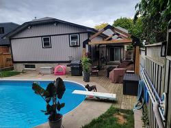 Start 2026 off in your NEW home! This beautifully updated 3-level backsplit blends family living, style, and outstanding outdoor fun. Get ready to enjoy spring and summer in your saltwater inground pool, fully fenced for kids and pets, complete with two gazebos, a mounted outdoor TV, and gas hookups for both your BBQ and fire table. Whether hosting friends, or enjoying quiet evenings, this backyard feels like your own private resort. Sliding doors off the kitchen make indoor–outdoor living effortless.A beautiful concrete front walkway and patio create wonderful curb appeal. Walk in the front door and the dramatic Zebrawood hardwood flooring immediately makes a memorable first impression, leading into the open-concept living and dining area, perfect for family life and entertaining. The kitchen features a full-size fridge AND full-size stand-up freezer, with direct access from the double garage—making grocery unloading easy and convenient. This home includes 3+1 bedrooms, 2 full baths including the primary ensuite, plus 1 additional half bath. All upper bedrooms feature IKEA closets, plus a large IKEA linen closet in the hallway. The lower-level family room includes a custom built-in TV cabinet, a cozy electric fireplace, and plenty of room for a kids’ play zone or home office. The garage offers excellent workspace potential, complete with built-in cabinets, a counter, and automatic garage doors—ideal for hobbies or extra storage. Located in a highly convenient area with easy access to grocery stores, malls, the lake, rec centres, schools, the library, boating, and major highways.Updates over the years include: electrical panel(2004); windows updated(2006–2008); IKEA kitchen cabinetry(2010); pool pump (2015); dramatic Zebrawood flooring (2017); owned hot water tank (2020); pool filter (2021); saltwater system (2022); front door, insulated garage doors, kitchen window, microwave & dishwasher (2023); and furnace (2024).