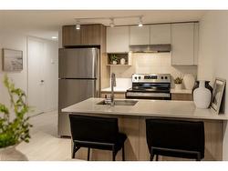 Welcome to Stationwest, where style and convenience meet in Burlington’s Aldershot Village. This bright 2-bedroom main-floor condo offers a thoughtfully designed layout with modern finishes, a private balcony, and one underground parking space. The gourmet kitchen features quartz countertops, stacked tile backsplash, stainless steel appliances, and a centre island with seating. Wide-plank flooring runs throughout the open-concept living and dining areas, creating a warm and contemporary feel. Both bedrooms are fitted with plush carpeting and generous closet space, while the spa-inspired bathroom includes quartz counters, a soaker tub with full-height tile surround, and polished chrome fixtures. Enjoy the convenience of in-suite laundry and the added peace of mind that comes with the durability of concrete construction. Stationwest places you steps from Aldershot GO, major highways, shopping, dining, and the waterfront—making it an exceptional opportunity for commuters, first-time buyers, or investors.NOTE: Seller to buy out all rental equipment — including the boiler, air handler, air conditioning unit, heat recovery ventilator (HRV), and hot water heater — on or before closing, saving the buyer approximately $215 + HST per month!