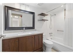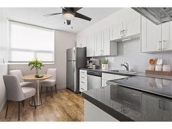 Beautifully maintained one-bedroom suite in central Burlington’s EmpressCondominium. This bright and spacious unit is ideally located in the heart of Burlington,just a short walk to the Burlington Centre, with easy access to shopping, dining, andmany amenities. The L-shaped living room leads to a large private balcony — perfectfor enjoying spectacular sunsets. The dining area is conveniently positioned off the eat-in kitchen, which features stainless steel appliances, granite countertops, and whiteshaker-style cabinetry. The generous bedroom includes a large double closet withmirrored doors. Updated four-piece bathroom. Convenient in-suite locker and laundryroom with full-sized washer and dryer. This carpet-free suite has been freshly paintedand is move-in ready. Includes one underground parking space. Residents enjoy 24-hour concierge service and an impressive range of amenities, including an outdoor pool,party room, library, fitness room, car wash bay, and ample visitor parking. Enjoy comfort,security and convenience in this well-managed condominium building.