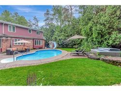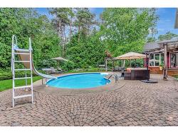 PRIVATE ESTATE LIVING – 22 Deerpath Court, an extraordinary residence tucked away on a quiet cul-de-sac, surrounded by towering trees and beautifully landscaped grounds. Situated on 1.17 private acres, resort-like property, this custom home offers over 5,018 sq ft of living space across 3 meticulously designed levels. The long, rounded driveway flows effortlessly toward an impressive 3-car garage & inviting covered front porch. Step inside the grand foyer, where a sweeping staircase, slate floors, and intricate trim work set the tone for timeless elegance. To your right, the formal living room offers rich herringbone hardwood floors & a statement fireplace—perfect for hosting guests or quiet evenings by the fire. The heart of the home is the magazine-worthy kitchen, featuring custom cabinetry, luxury appliances, stone counters, and a butcher block island. The bright breakfast area & family room are wrapped in windows with incredible views of the backyard retreat. Sunlight pours into the bonus sitting room—an ideal space to curl up with a coffee and take in the peaceful, natural surroundings. The main floor also offers a private office with fireplace, a spacious formal dining room, & a luxurious primary suite with double walk-in closets & spa-like ensuite overlooking the pool. Upstairs, you’ll find 3 generous bedrooms, 2 full bathrooms, & ample storage. The fully finished basement expands your living space with a rec room, bedroom, 3pc bathroom, and abundant storage, plus direct garage access—perfect for multi-generational living or future in-law potential. Step outside and discover your private oasis: an inground pool with slide, hot tub, lounging areas, and manicured gardens create the ultimate space for summer entertaining. This home truly combines luxury, privacy, and function in one of Cambridge’s most desirable enclaves, just minutes to shopping, trails, golf, & highway access. Welcome to your forever home on Deerpath Court—where every day feels like a getaway.
