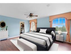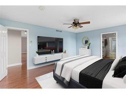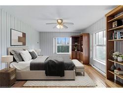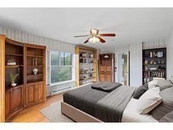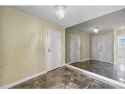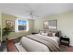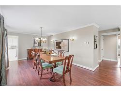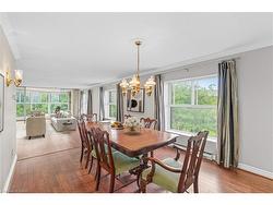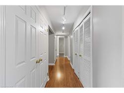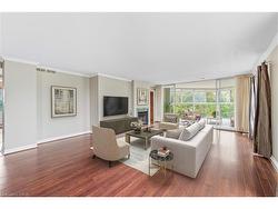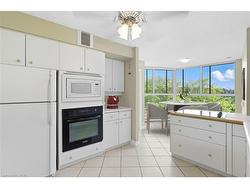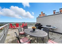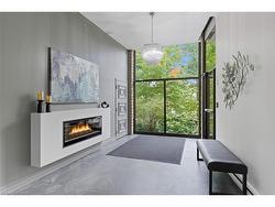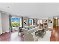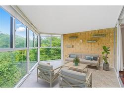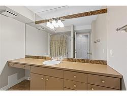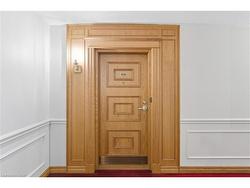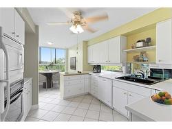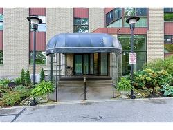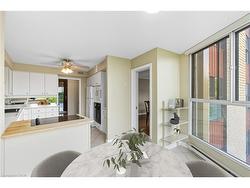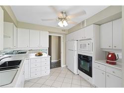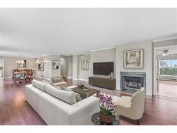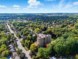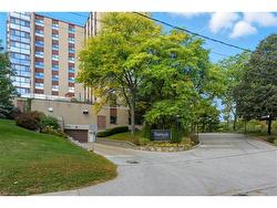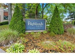 Welcome to The Highlands by the Park; 20 Berkley Road. Nestled atop a hill at the end of a quiet cul-de-sac in historic West Galt, this prestigious condominium offers tranquility, privacy, and sweeping views of nature and the city skyline. Overlooking a majestic woodlot, Victoria Park, and beyond, this building is one of Cambridge's hidden gems. This spacious 2,418 square foot, carpet-free unit offers a rare combination of size, layout, and natural light. With 3 generously sized bedrooms, 2 full bathrooms, and a thoughtfully designed floor plan, it’s ideal for those seeking a blend of comfort and functionality. Step into an impressive foyer with mirrored walls and a large closet before entering the bright eat-in kitchen, complete with ceramic tile, crisp white cabinetry, built-in range top, track lighting and a cozy breakfast nook that looks out over lush greenery. The kitchen opens into a formal dining room with laminate flooring and elegant wall sconces; perfect for entertaining. The adjacent oversized living room features a wood-burning fireplace (sold in as-is condition) and leads to a bright all-season solarium with floor-to-ceiling windows, perfect as a den, office, or creative space. Down the hallway, you’ll find three spacious bedrooms, including a large primary suite with two large windows, an expansive walk-in closet, and a 5-piece ensuite. A second 4-piece guest bath serves the remaining bedrooms. The in-suite laundry closet is conveniently tucked away off the main hallway. Building amenities include a rooftop terrace with panoramic views, ample seating, and barbecue, a party room with full kitchen and lounge area, meeting room, exercise room, and beautifully maintained common spaces. This unit includes one underground parking spot with a tandem storage locker. Don’t miss this rare opportunity to live in a peaceful, elevated community surrounded by nature, just minutes from the charm and culture of West Galt.