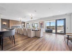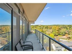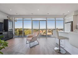Stunning view from this 9th floor unit in The Gaslight District! Discover this lovely 2-bedroom, 2-bathroom corner condo just steps from the Grand River, offering spectacular treed views of West Galt. With 9-foot ceilings, laminate flooring, and an open-concept layout, this home combines style with comfort. The spacious living room flows into a modern kitchen featuring sleek white cabinetry, quartz countertops, upgraded stainless steel appliances, and a large island perfect for cooking and entertaining. Enjoy direct access to the full-width balcony from both the living room and the primary suite. The primary bedroom includes two closets and a spa-like 4-piece ensuite with double sinks and a walk-in shower. A second bedroom, full 4-piece bath, and convenient in-suite laundry complete the space. One parking spot is included. Being a corner unit not only do you get extra windows, but you get a fantastic view of both the North and West sides of the building. Residents enjoy exceptional amenities: numerous lounges, games room with billiards and ping pong, a state-of-the-art fitness and yoga studio, stylish party room with bar, co-working spaces, and multiple outdoor terraces overlooking Gaslight Square, complete with fire pits, pergolas, and BBQs. Step outside to enjoy the vibrant lifestyle-walk the Grand River trails or explore downtown's cafes, shops, and the weekend Farmer's Market. Experience the best of The Gaslight District- with events and fabulous restaurants! Maintenance Fee also includes gas and internet. Book your private showing today!
