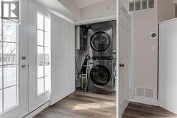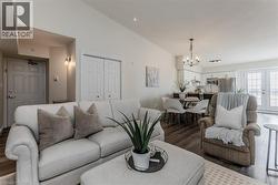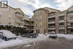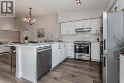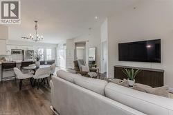 Welcome to a beautifully upgraded condo retreat backing onto a tranquil park, nestled in the highly sought-after Glen Abbey neighbourhood. Surrounded by scenic trails and green spaces, yet just minutes to highways and everyday essentials, this location strikes the perfect balance between convenience and calm—ideal for first-time buyers and downsizers alike. Inside, the space is bright, fresh, and thoughtfully updated throughout. Newer laminate flooring (2024), fresh paint, and upgraded light fixtures create a modern, move-in-ready feel, while vaulted ceilings in the main living area add an airy sense of volume. The open-concept layout flows effortlessly from the living and dining areas into a stylish, upgraded kitchen featuring quartz countertops (2024), a classic subway tile backsplash, custom cabinetry (2024), stainless steel appliances (2024), and a peninsula with breakfast bar—perfect for casual meals or entertaining. A walkout leads to a private balcony overlooking the park, offering a peaceful outdoor escape. The spacious primary bedroom features a large window and a 4-piece ensuite with an upgraded vanity. A second bedroom provides flexibility for guests, a home office, or hobby space, while the 3-piece main bath impresses with a walk-in shower and upgraded vanity. In-suite laundry with newer machines (2024) adds everyday ease. Complete with one underground parking space and a storage locker, this well-managed building also offers fantastic amenities including a clubhouse with gym and sauna, plus a convenient underground car wash. A perfect opportunity to enjoy low-maintenance living in a prime, park-side setting. (id:7525)
